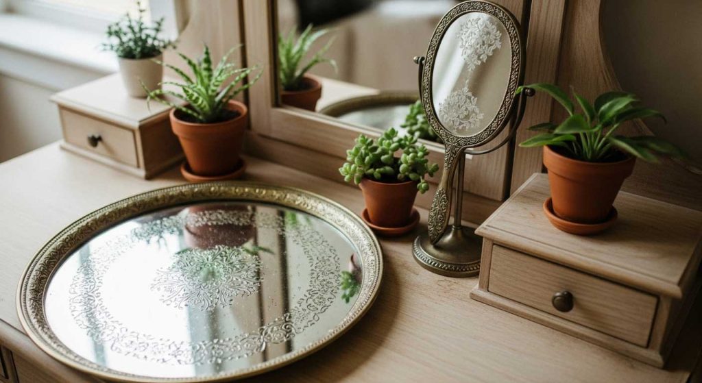 - Antique mirror tray and vintage mirrored vanity tray: Charming additions to vanity tables.